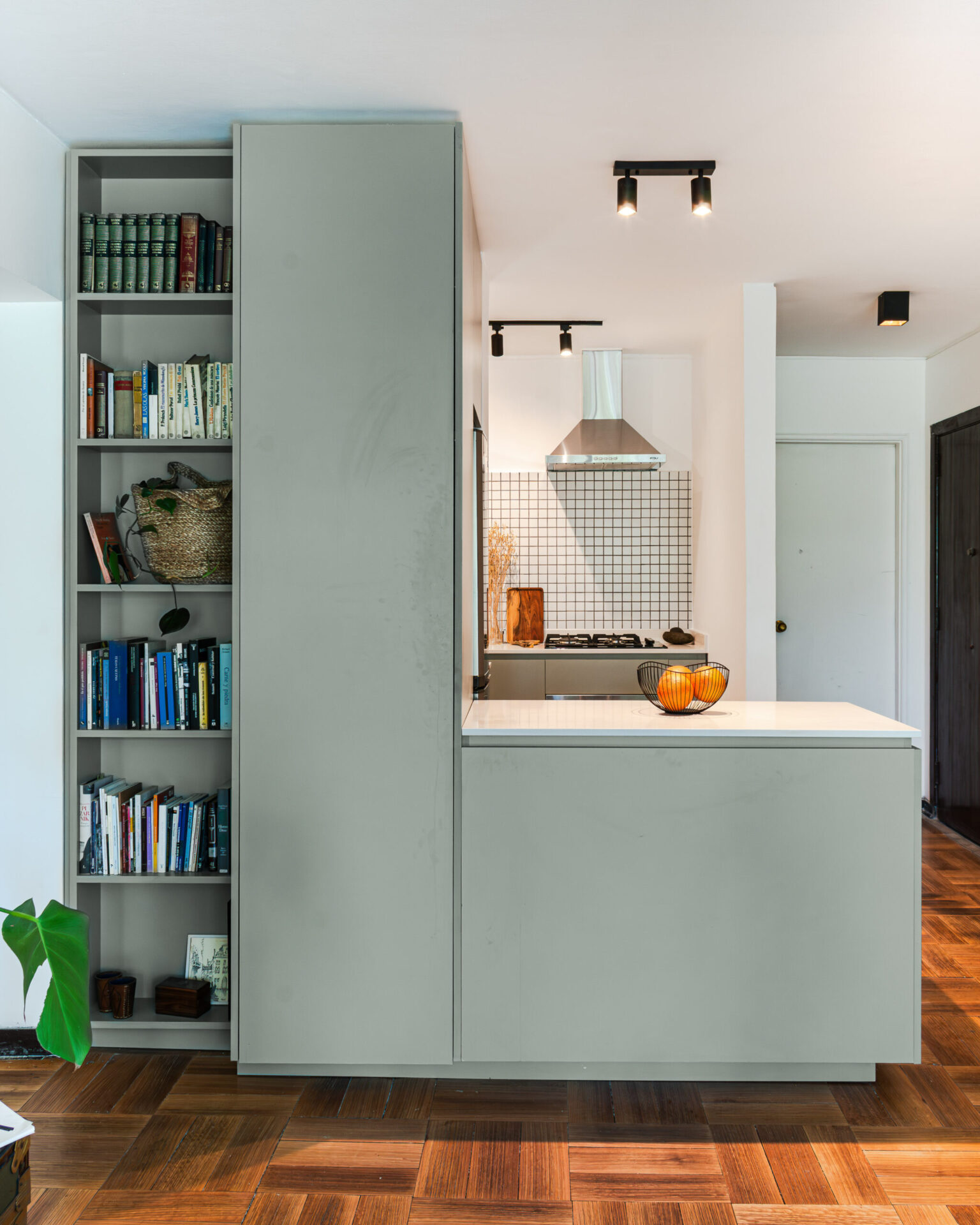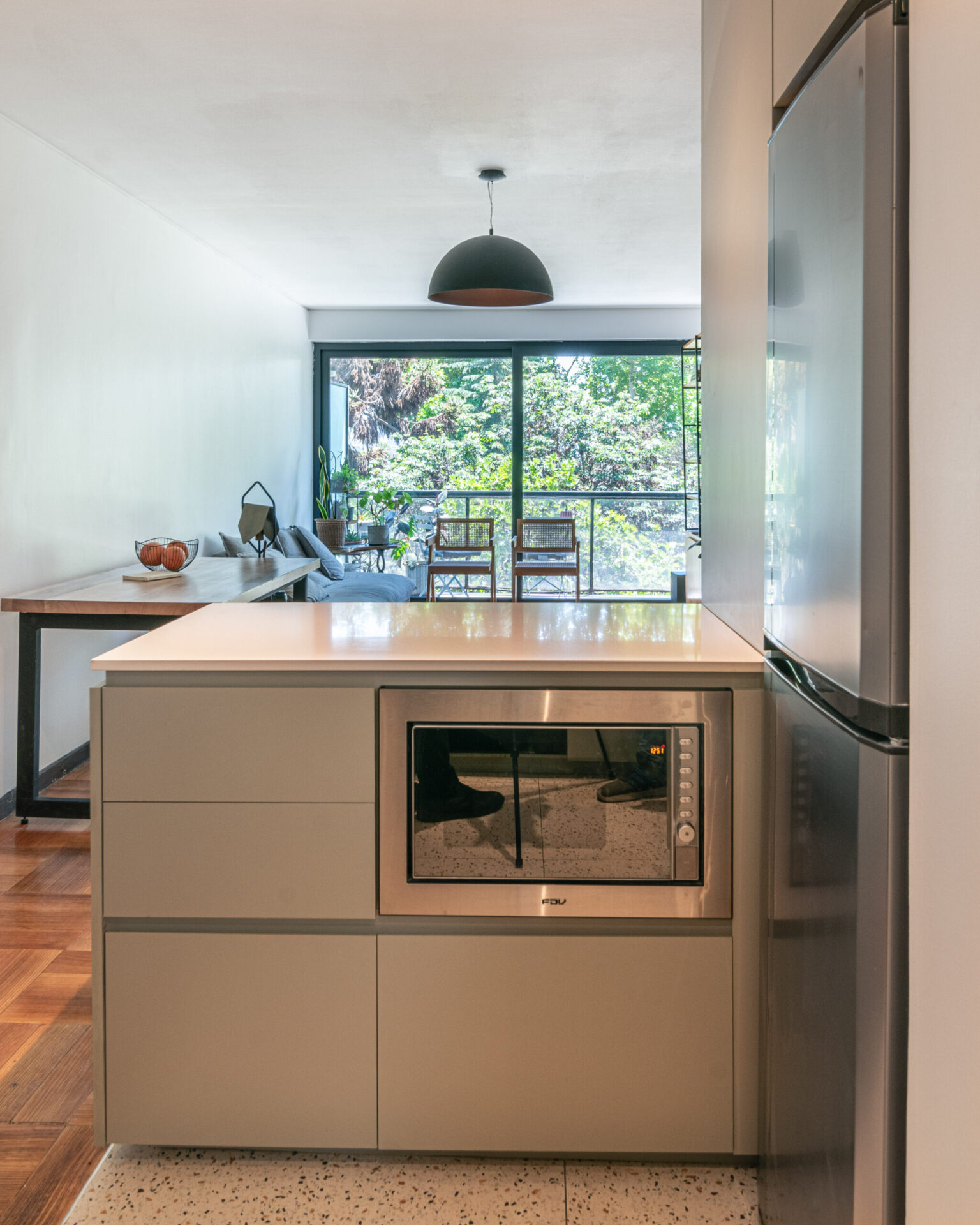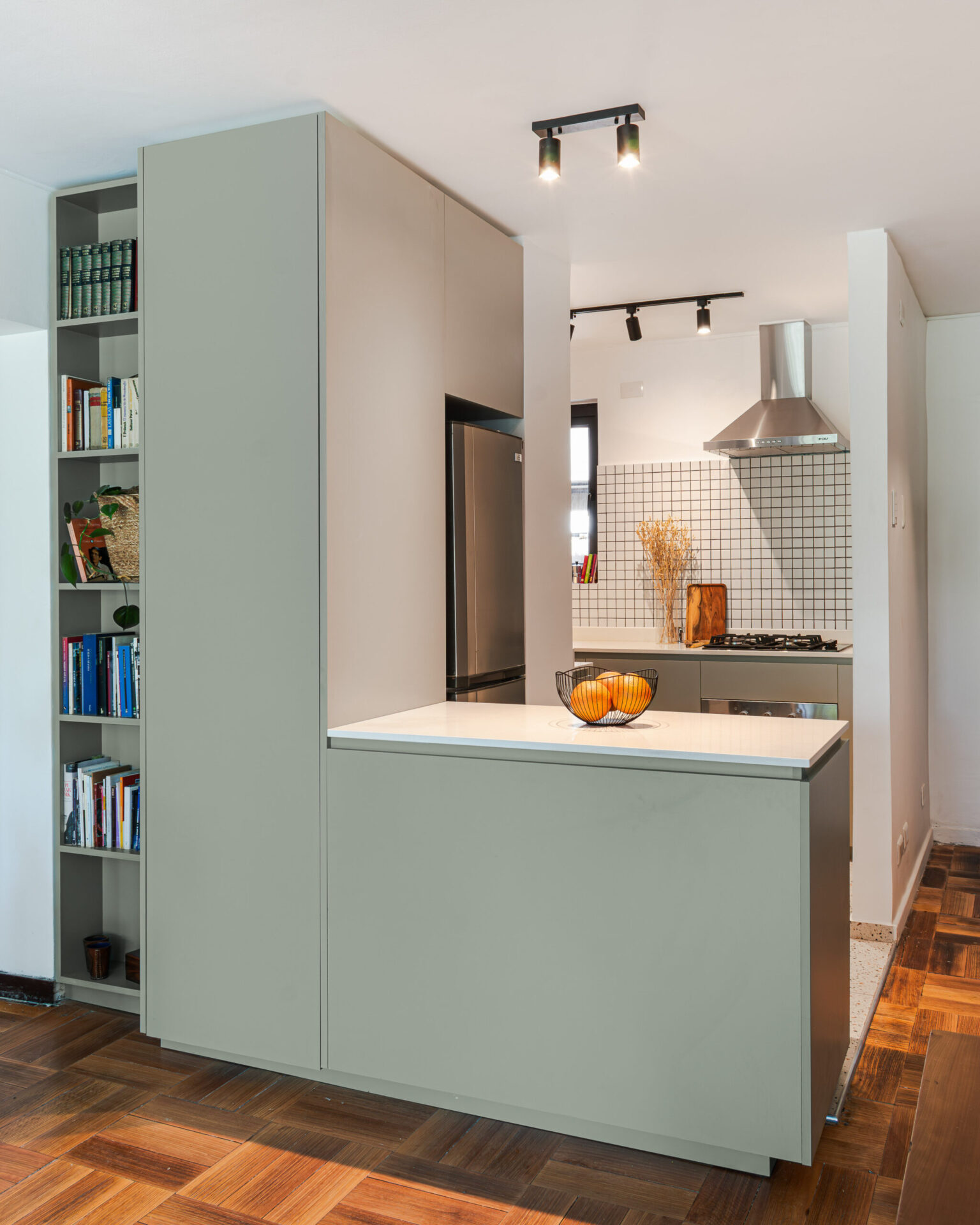 Este proyecto parte de una lectura atenta del espacio y de cómo se habita. La cocina Forestal se articula a partir de frentes lisos de color, junto a cubiertas de cuarzo y salpicadero de cerámica, definidos como un conjunto coherente donde la materialidad y el uso cotidiano se integran con naturalidad. Cada decisión está orientada a ordenar el espacio y acompañar el día a día del hogar con naturalidad y continuidad.