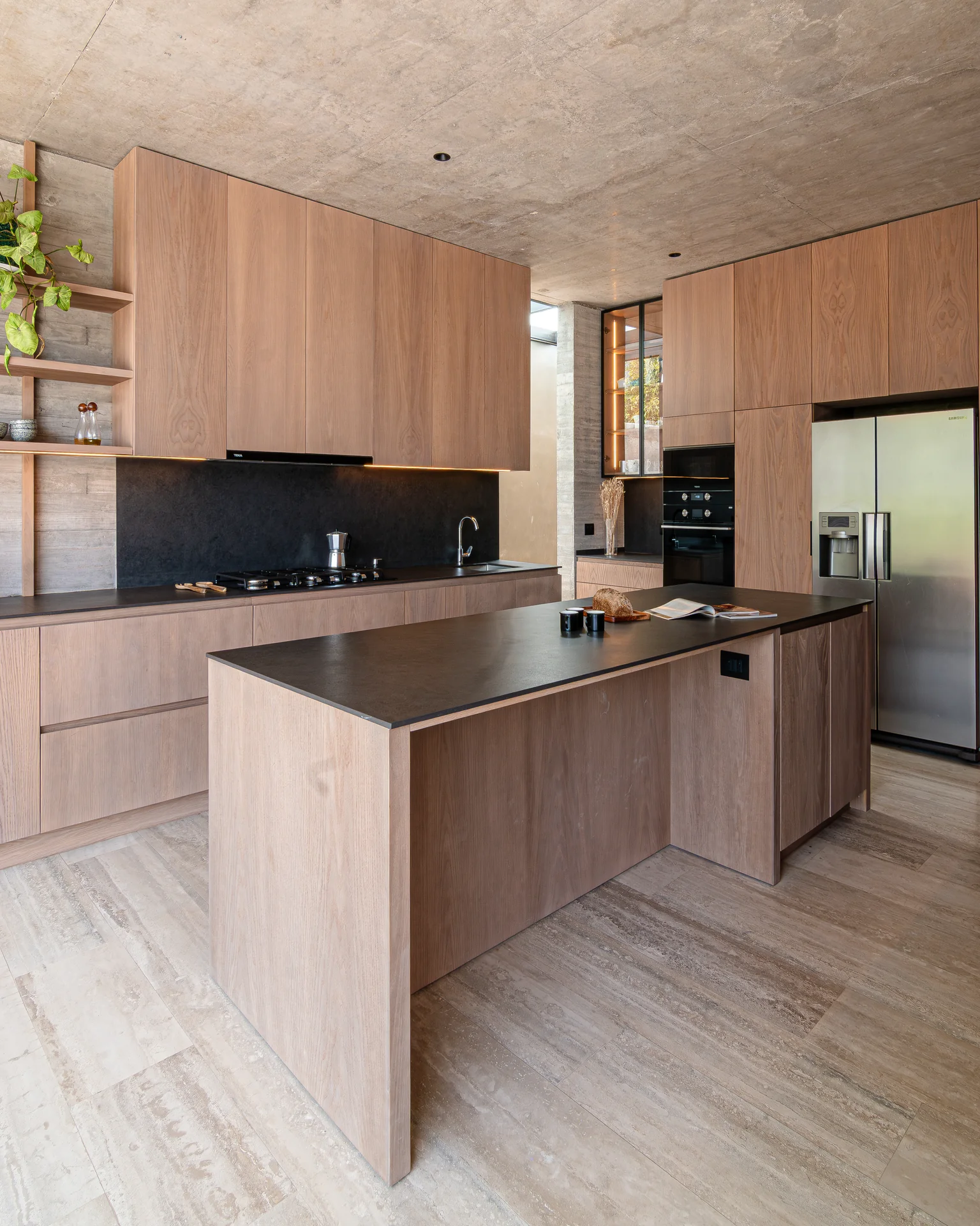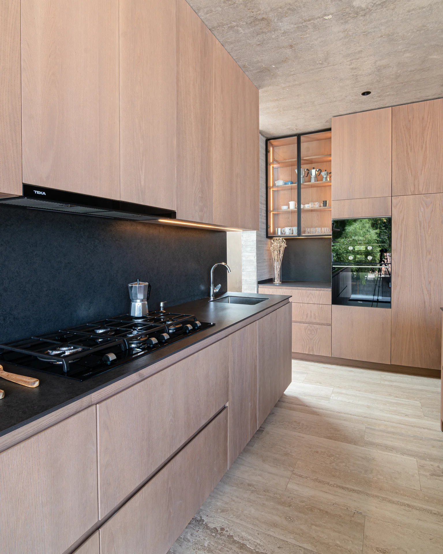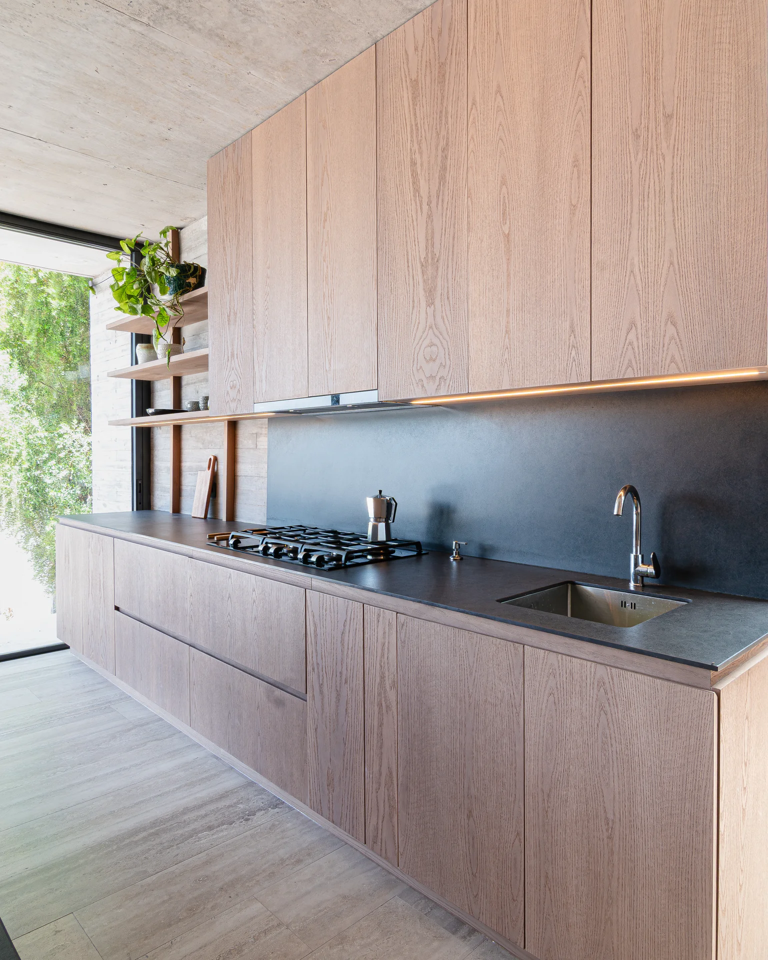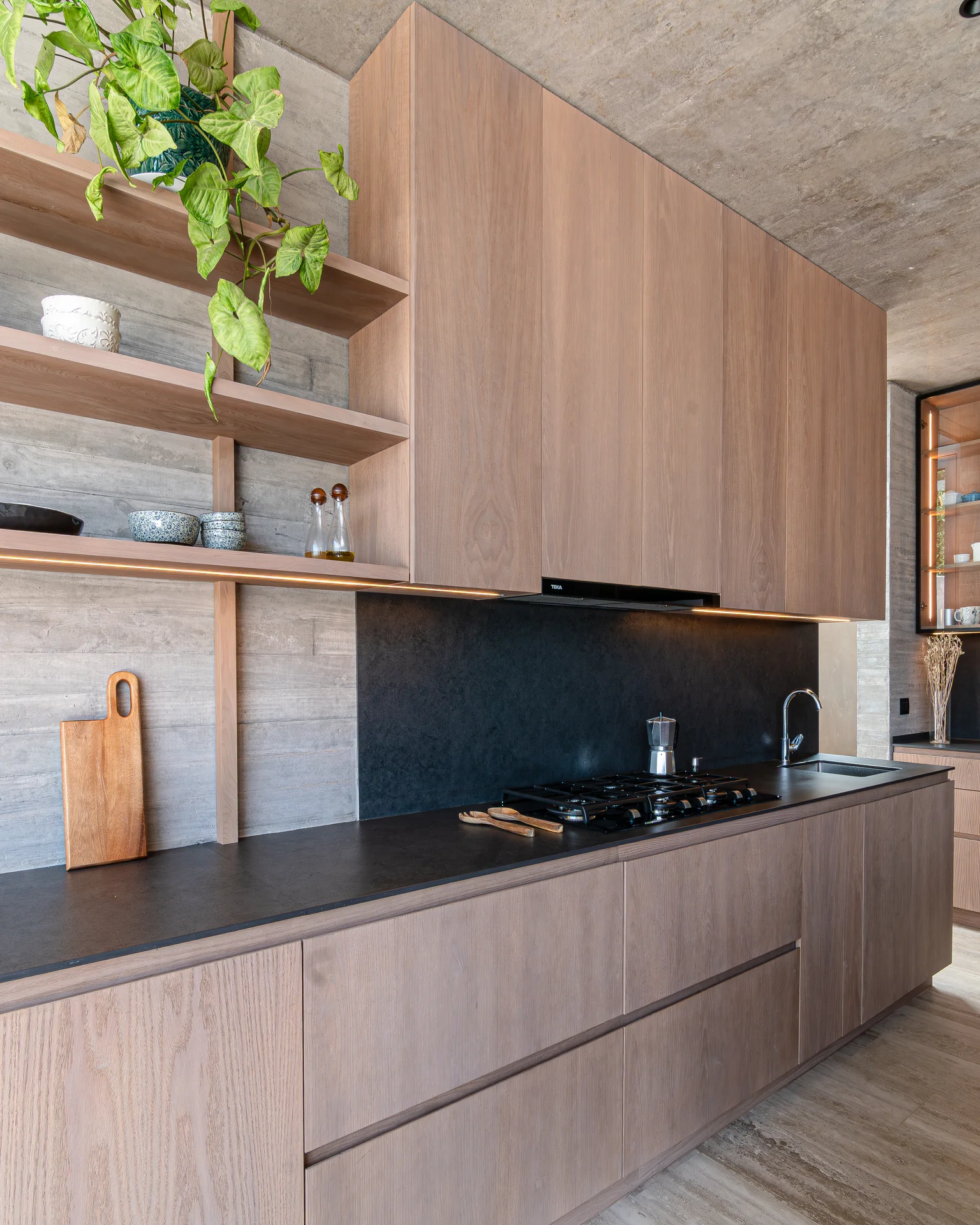 Este proyecto parte de una lectura atenta del espacio y de cómo se habita. La cocina Mirador se articula a partir de frentes lisos en madera, junto a cubiertas y salpicadero de piedra sinterizada, definidos como un conjunto coherente donde la materialidad y el uso cotidiano se integran con naturalidad. Cada decisión está orientada a ordenar el espacio y acompañar el día a día del hogar con naturalidad y continuidad.